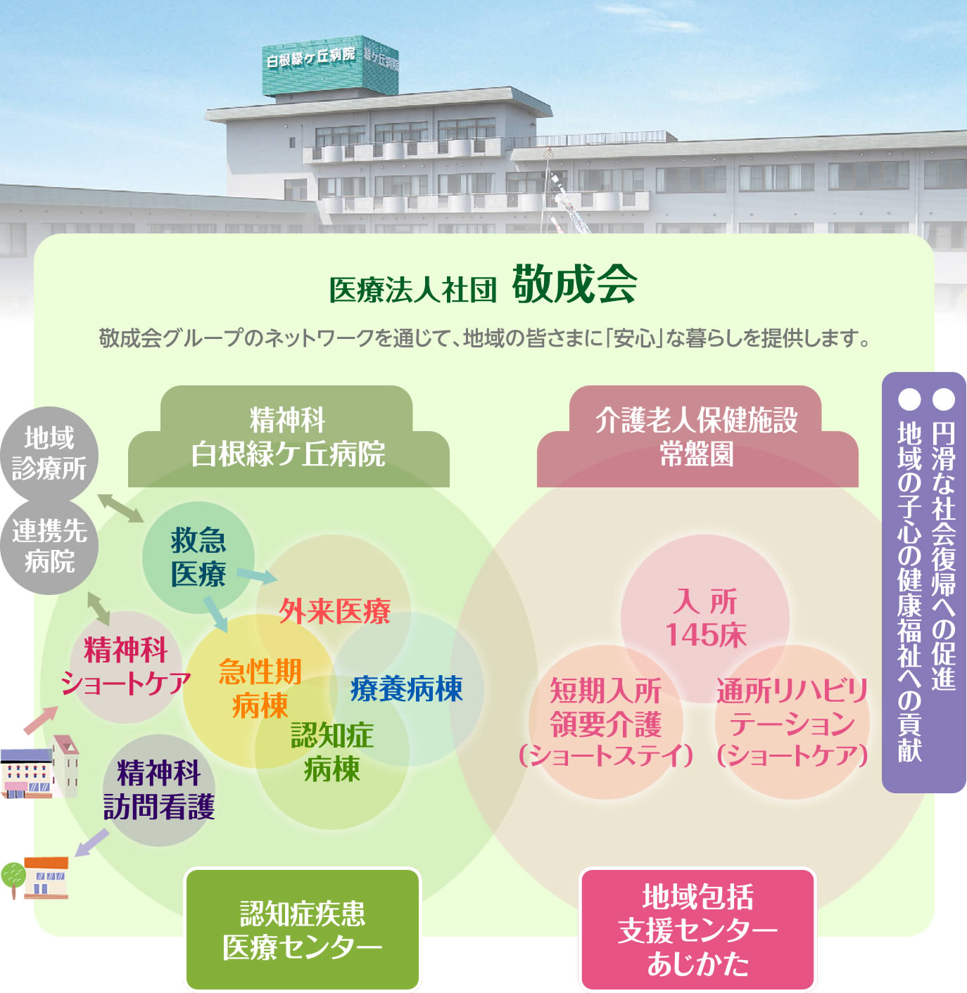 敬成会は、精神科医療機関としての白根緑ケ丘病院を中心に、介護老人保健施設常盤園を併設し、近年の超高齢化社会に対応した地域の中核的医療機関の役割を担っております。